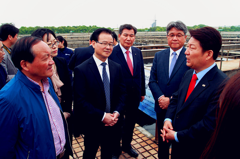 425日,由韓國大邱市市長權泳臻帶隊的韓國大邱市友好經貿訪問團一行26人,在紹興市副市長徐明光、副區長王志強等陪同下,到紹興水處理公司參觀考察。集團公司副總經理胡張堯等陪同。