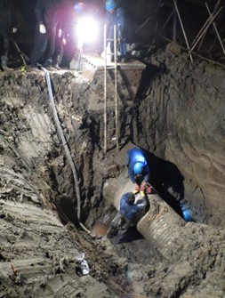 12月19日,公司中控室接到群眾反映,329國道昌峰印染廠對面綠化帶上有大量污水從地下冒出,公司領導及相關部門人員立即趕往現場。通過管位勘察、運行分析和污水狀態等綜合分析后確認為公司錢一至錢二DN800砼管泄漏。當即,維修人員奮力搶修,出動移動發電機、挖掘機等大型機械上陣,由于整個搶修計劃得當,措施有力,僅僅7個半小時,順利完成搶修任務。